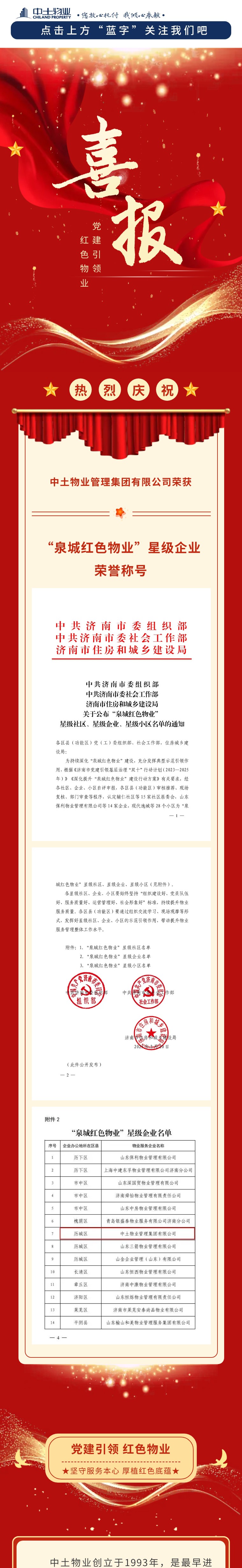 熱烈祝賀中土物業(yè)管理集團榮獲“泉城紅色物業(yè)”星級企業(yè)